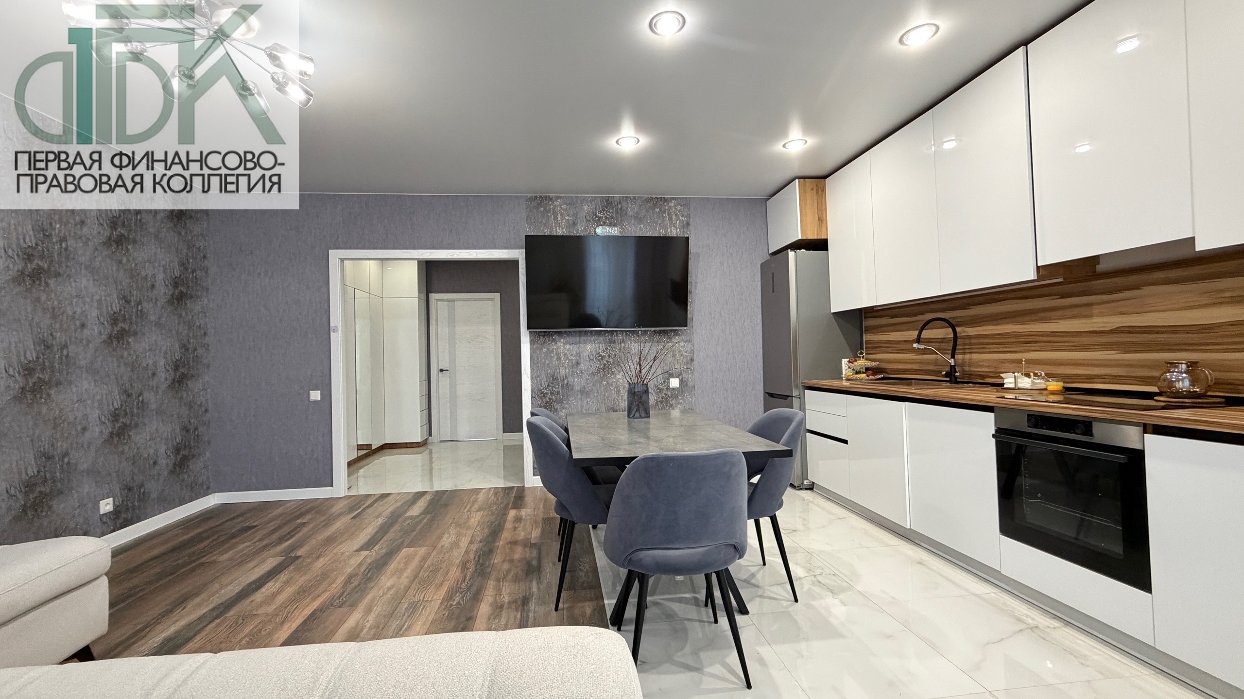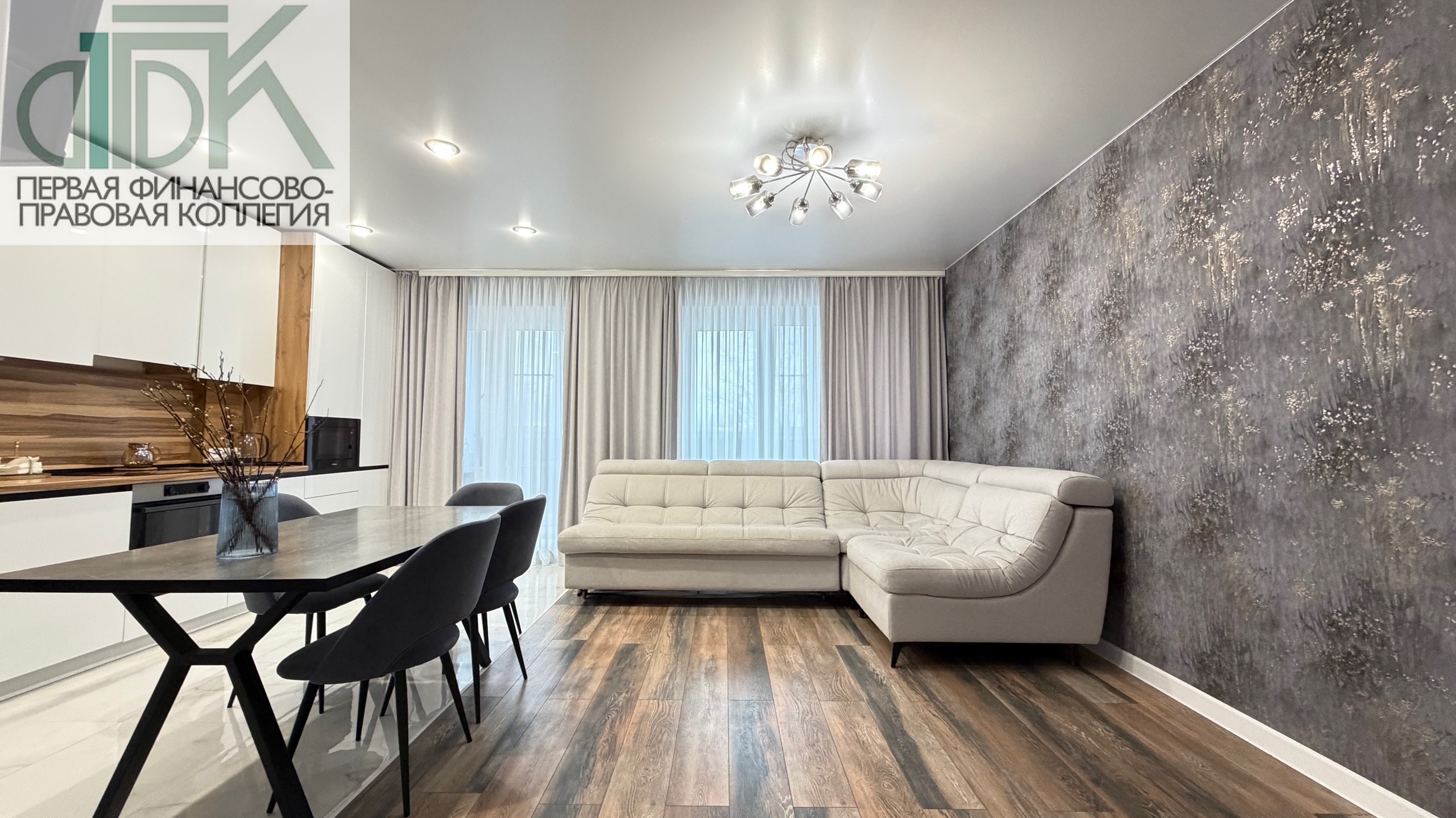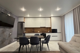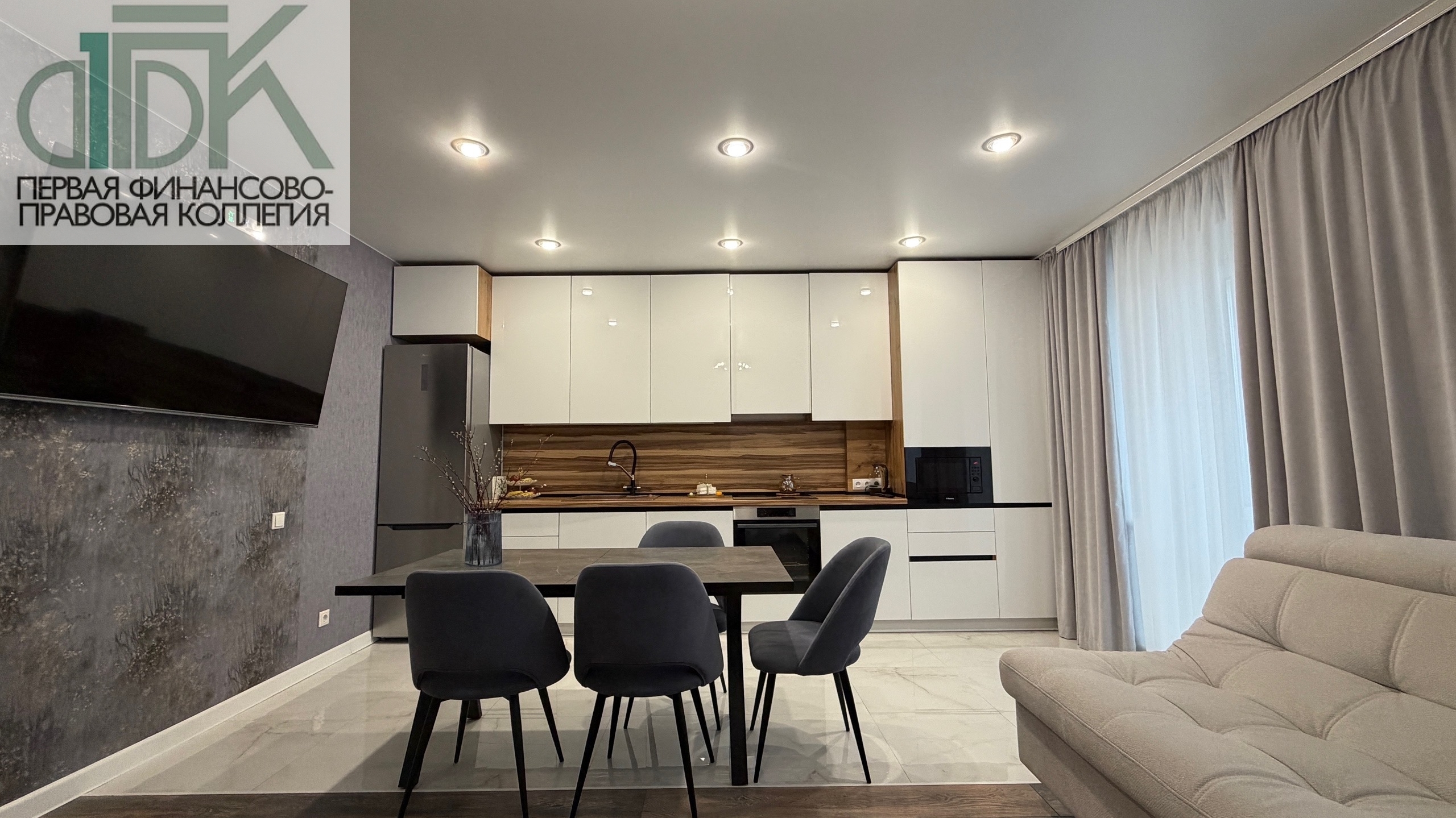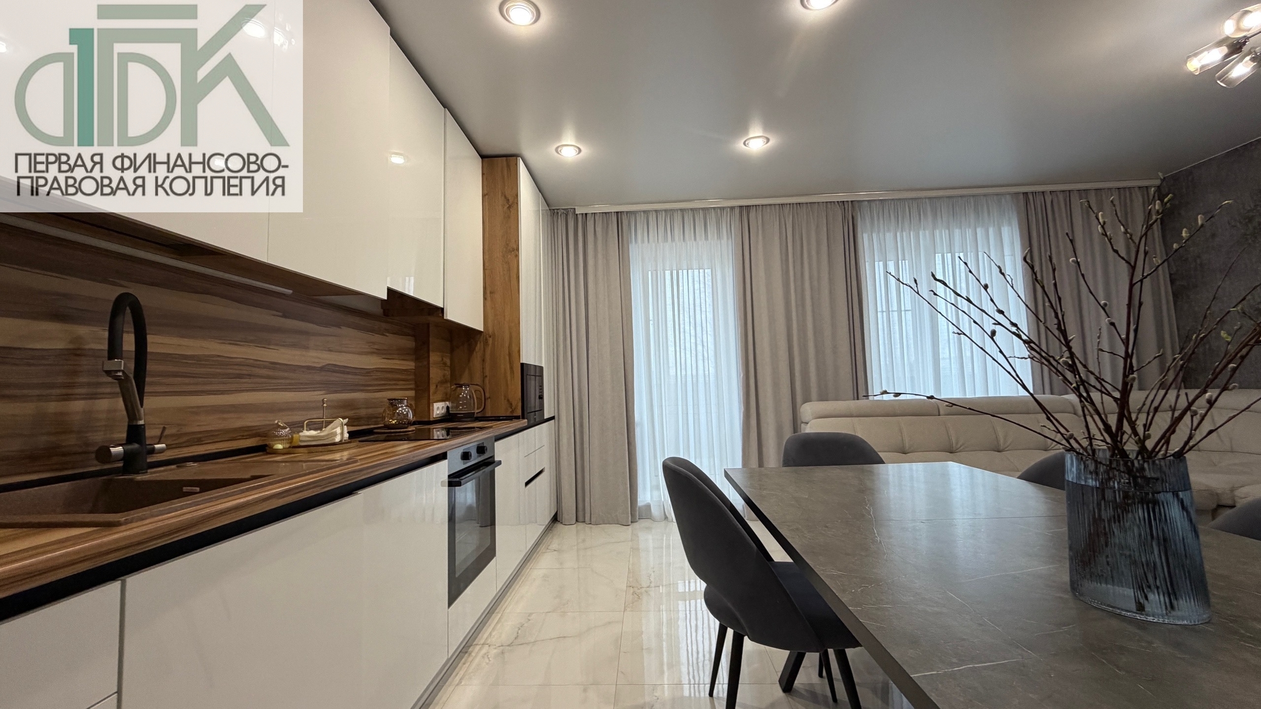В подарок новым владельцам остаётся стильный кухонный гарнитур с варочной панелью, духовым шкафом и микроволновой печью, а также шкаф в ванной, шкаф в прихожей и кондиционер.
